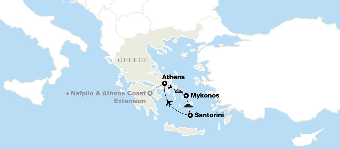 - Ferry rides from Athens to Mykonos and Mykonos to Santorini, as well as a flight from Santorini to Athens, are included in the price of your tour.
