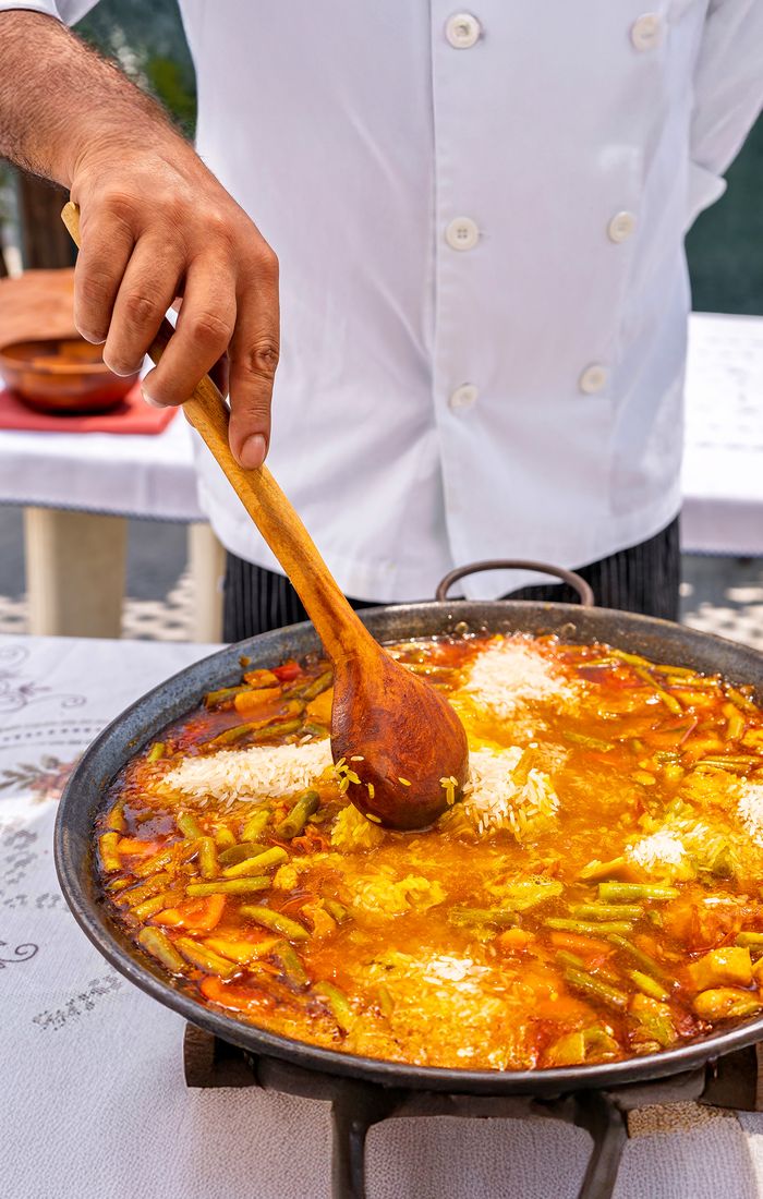 - Loading up your paella pan during a hands-on cooking class